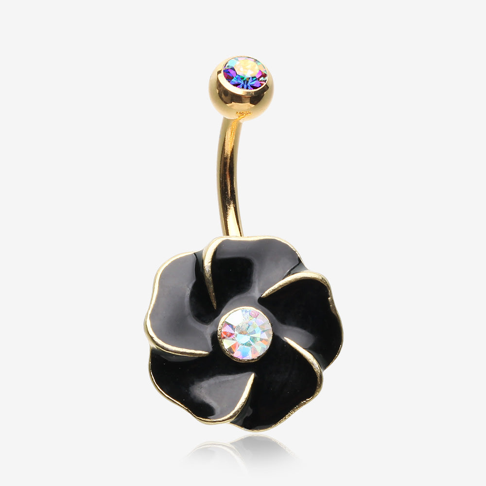 Golden Black Hibiscus Flower Sparkle Belly Button Ring