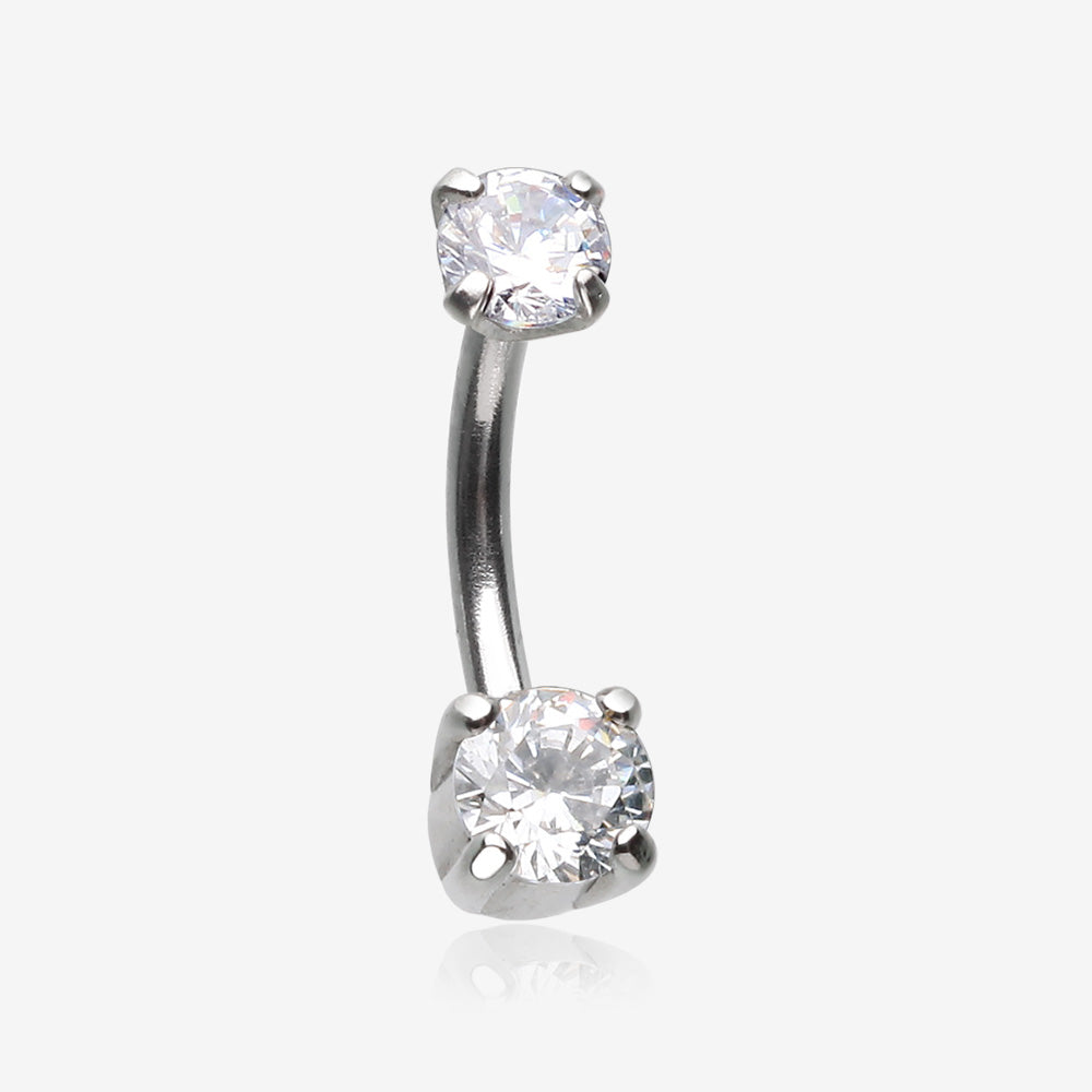 This internally threaded curved barbell features gorgeous sparkle gems in prong settings.Enjoy the versatility of this piece on your favorite piercing.